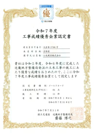 令和7年度近畿地方整備局工事成績優秀企業の認定を受けました